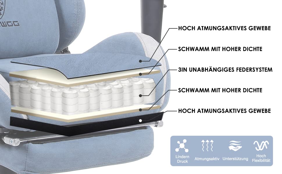 Net als de huid van een baby: de stof van deze gamingstoel bestaat uit “technische stof”. In vergelijking met andere natuurlijke vezels en synthetische vezels heeft deze technische doek een betere slijtvastheid en ademend vermogen en voelt tegelijkertijd aan als mijn huid. Het belangrijkste is dat als je schattige katten en honden hebt, hoef je je geen zorgen te maken dat je poten gemakkelijk onherstelbare vlekken achterlaten.
