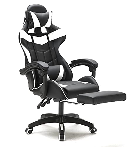 Een trendy en comfortabele wit zwarte stoel met voetsteun waarin je kunt gamen en werken in de juiste houding. Deze fijne en luxe bureaustoel en of gamestoel met voetsteun heeft een race geïnspireerd design. De voetensteun biedt extra ondersteuning en schuif je eenvoudig onder de zitting als je deze niet wilt gebruiken. De dik gestikte kunstlederen PU bekleding is makkelijk te reinigen en als extra kwalitatieve dikke padding op de armsteunen de zitting en rugleuning voor een goed zitcomfort. Het ergonomisch ontwerp zorgt voor de juiste zithouding en neksteunen en lendenkussens garanderen een stevige ondersteuning waardoor je in staat bent om vele uren te werken studeren of gamen zonder problemen. De stoel kan 360 graden draaien. Het zitvlak Is in hoogte verstelbaar van 46 cm tot 56 cm dat is hoogte rugleuning van 118 cm tot 128 cm. De rugleuning is individueel instelbaar kantelbaar op basis van het lichaamsgewicht. De stoel heeft 5 stevige nylon wielen om de stabiliteit te verzekeren ook bij intensief gamen. Of het nu harde of zachte ondergrond is deze stoel rijdt altijd makkelijk over het oppervlak. Kleur: zwart met wit. Afmetingen stoel: hoogte rugleuning: 118 – 128 cm. Breedte 63 cm x diepte 50 cm. Zithoogte: 46 – 56 cm. Zitdiepte: 49 cm. Zitbreedte 50 cm. Hoogte rugleuning 68 cm. Maximaal draagvermogen: 110 kg. Levering inclusief montage handleiding en benodigde montage materialen.