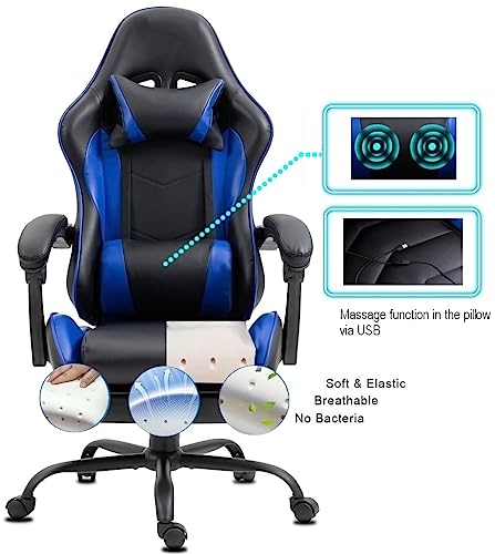 Gemani Bureaustoel, gamingstoel, massagefunctie, USB-gamingstoel, ergonomische gamerstoel met voetensteun, hoofdsteun, massage-lendenkussen, gamingstoel, draaistoel 02-0042 (blauw)